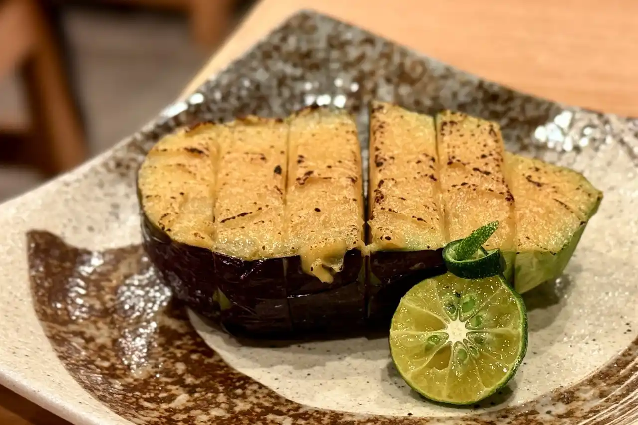 『水ナスのシークヮーサー味噌田楽』は、大阪・泉州の~百生~中出農園から直送された水ナスをサッと揚げて、シークヮーサー香る甘い味噌で仕上げた一品。野菜の甘みと味噌のコクが際立ち、ハイボールや泡盛サワーと好相性です。 |
