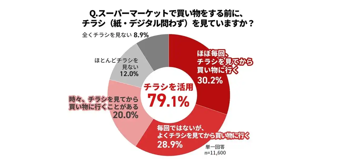 スーパーマーケットで買い物をする前にチラシ(紙・デジタル問わず)を見る頻度について調査したところ、「ほぼ毎回、チラシを見てから買い物に行く」が30.2%、「毎回ではないが、よくチラシを見てから買い物に行く」が28.9%、「時々、チラシを見てから買い物に行くことがある」が20.0%で、合計79.1%の消費者がチラシを活用して買い物をしていることがわかりました。物価高が続く中で、チラシが重要な情報収集手段として広く浸透している実態が明らかになりました。 |