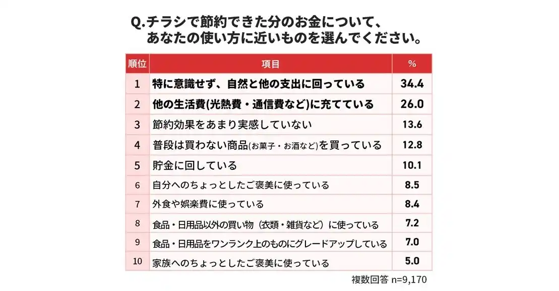 チラシで節約できた分のお金の使い道について複数回答で尋ねたところ、「特に意識せず、自然と他の支出に回っている」が3人に1人にあたる34.4%で最も多く、次いで「他の生活費(光熱費・通信費など)に充てている」が26.0%となりました。この2つを合わせると約6割(60.4%)の人が生活費の補填に当てており、節約効果の多くが基本的な生活維持に使われている実態が明らかになりました。「普段は買わない商品(デザート・お菓子・お酒など)を買っている」(12.8%)、「貯金に回している」(10.1%)と続き、物価高の中で、チラシ活用による節約が家計の生活防衛に直結していることがうかがえます。 |