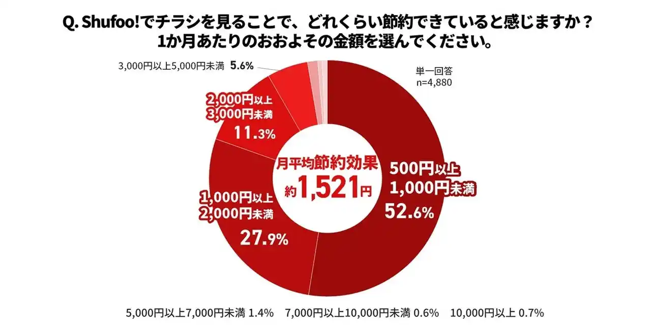 Shufoo!でチラシを見ることによる節約効果を具体的な金額で実感している利用者(4,880人)を見てみると、最も多い回答は「500円以上1,000円未満」で52.6%と半数を超えました。次いで「1,000円以上2,000円未満」が27.9%、「2,000円以上3,000円未満」が11.3%と続きました。 |