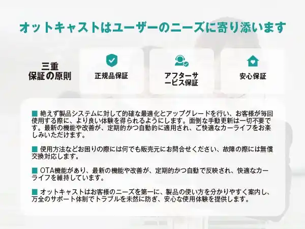 | Ottocast(オットキャスト)は、10年以上のマルチスクリーン相互接続技術の開発経験を有し、先端技術を採用して信頼性の高い車載用電子パーツを研究開発・生産しております。OttocastはAmazonトップグローバルセラーであり、日本、アメリカ、イギリス、ドイツ、カナダ、フランス、スペインなどを中心に30カ国以上で販売しております。お客様にご満足いただけるよう、商品づくりを目指し、1年間安心保証付き、日々サービス向上に努めています。 | |||||||||||||||||||