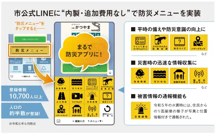 | 2022年8月に発生した線状降水帯により、河川の氾濫、住宅や農地の浸水など、甚大な被害をもたらした勝山市。幸い人的被害はなかったものの、初めての大雨災害の経験で、住民への伝達など初動に課題が残ったことで、新たな情報伝達ツールを模索。 | |||