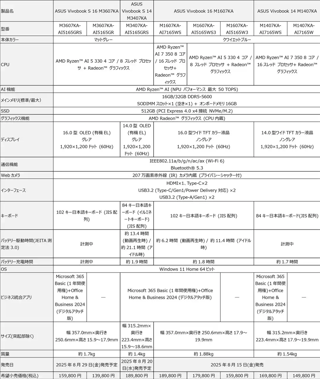 「ASUS Vivobook S 16 M3607KA / S 14 M3407KA」および「ASUS Vivobook 16 M1607KA / 14 M1407KA」4製品8モデル発表 |
