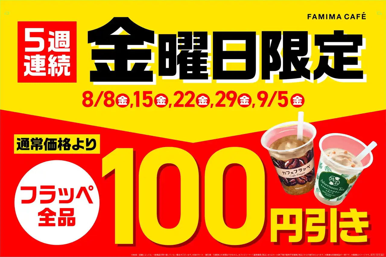 ファミリーマートでは、記録的な猛暑が続くこの時期に、毎週金曜日をフラッペフライデーとして、フラッペ全品を100円引き(税込)でおトクにお楽しみいただけます。 |