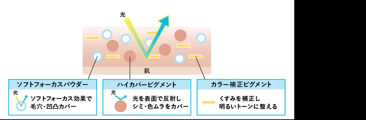 ◇ソフトフォーカスパウダー・ハイカバーピグメント・カラー補正ピグメントを配合。 |