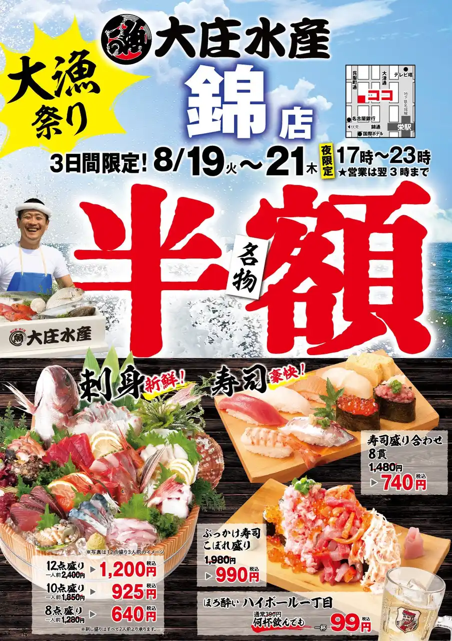 浜焼き海鮮居酒屋『大庄水産』錦店(運営:株式会社大庄)は、2025年8月19日(火)より8月21日(木)までの3日間、日頃のご愛顧に感謝を込め、17時~23時限定で刺身盛り合わせと寿司を半額とする“名物!半額祭”を実施します。