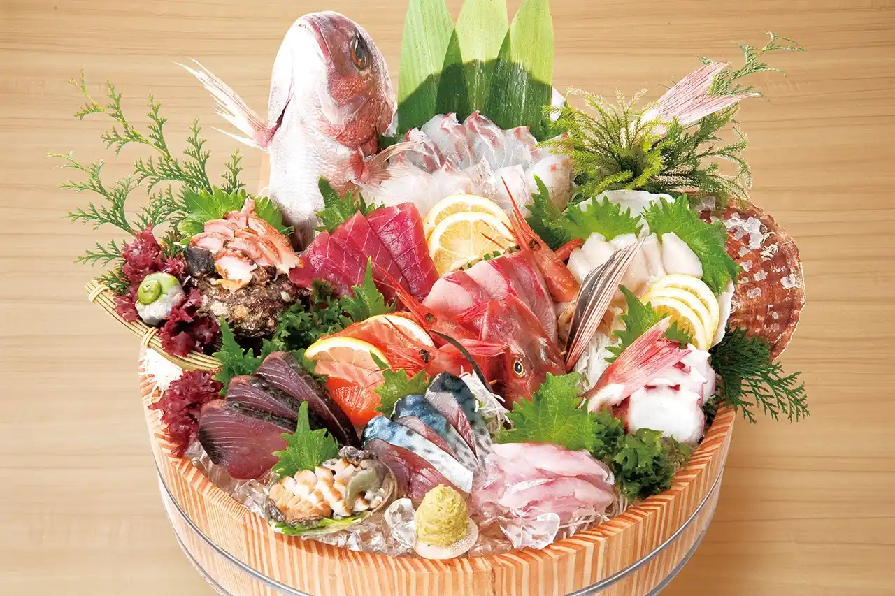 さらに、『大庄水産』の豪快さを象徴するのが「刺身盛り合わせ」。その日ごとに仕入れる旬の鮮魚を中心に、板前が丁寧に捌き桶に盛って提供します。鮮度と迫力を兼ね備えた一品です。 |
