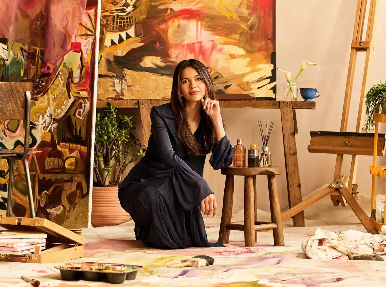 この香りは、まるで音楽の旋律が広がるように、一つひとつのノートが繊細に重なり合いながら空間を満たしていきます。ハッサンのアートワークも同様に、じっくりと目を凝らすことで、その奥深いディテールが静かに浮かび上がってきます。2枚のポートレートで構成されたディプティク(二連画)として描かれた本作では、ゴールド、深みのあるアンバー、そしてバーントレッドの豊かな色彩が、意外性のあるテクスチャーと溶け合いながら、「陶酔感に満ちた夢のようなオアシス」を描き出しています。