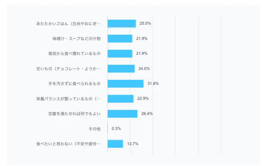 非常時に食べたいものとして最も多かったのは「手を汚さずに食べられるもの」(31.8%)でした。次いで「空腹を満たせればよい」(26.4%)、「温かいごはん(おにぎり等)」(25.0%)、「普段から食べ慣れているもの」(21.9%)が続きました。 |