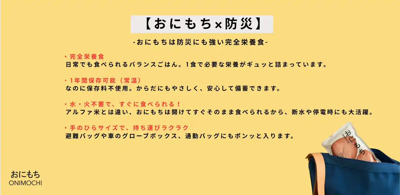 その観点から、『おにもち』のような「常温で長期保存でき、調理や水が不要で、栄養バランスが整った食品」は、外出先を含む日常の行動に組み込みやすく、備えを習慣化しやすいと評価しています。 |