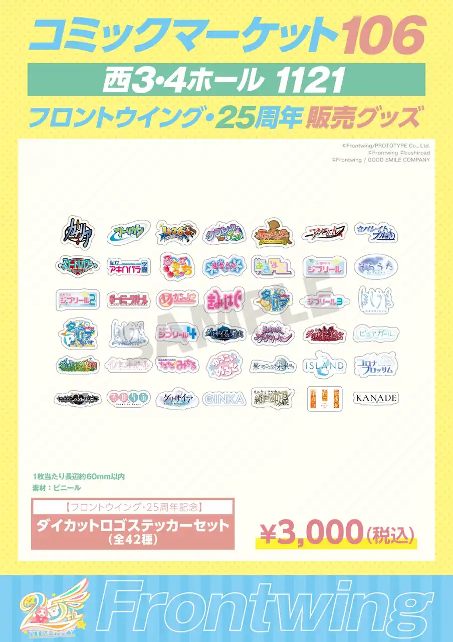 コミックマーケット106にて2種類のグッズに『KANADE』がラインナップ! 1つ目は、フロントウイングのゲーム作品のロゴを使った「ダイカットロゴステッカーセット(全42種)」 2つ目は、フロントウイングの主要なゲーム作品がラインナップされた「パッケージアクリルキーホルダー(ランダム16種)」 |