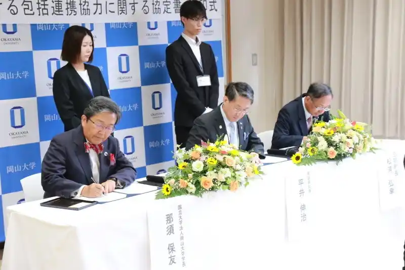 | 国立大学法人岡山大学(本部:岡山市北区、学長:那須保友)は2025年8月4日、平成28年に締結した「岡山大学、鳥取県及び鳥取県三朝町の三者間における連携協力に関する協定」の内容を教育、医療、健康、研究、交流の諸活動および社会貢献活動に広げ、グローバル人材の育成、地域の活性化および地域の医療と健康な暮らし等に資することを目的に変更協定を締結しました。 | ||||