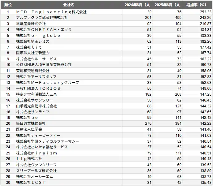 株式会社SalesNow(本社:東京都渋谷区、代表取締役:村岡功規、以下「当社」)は、国内540万社の企業情報を完全網羅した日本最大級のデータベース「SalesNow DB」より、人口の多い上位30都市を対象とした「従業員数増加率ランキング」を発表しました。本リリースでは、各都市別のデータをもとに、今回は「さいたま市に本社を置く企業」を対象に、従業員数の増加傾向にフォーカスします。