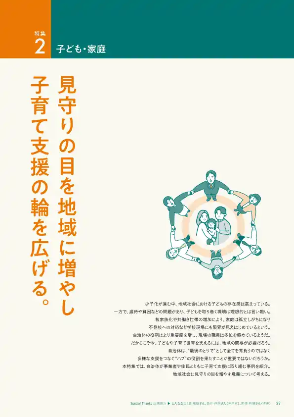 自治体は、“最後のとりで”として全てを背負うのではなく、多様な支援をつなぐ“ハブ”の役割を果たすことが重要ではないでしょうか。本特集では、自治体が事業者や住民とともに子育て支援に取り組む事例を紹介。地域社会に見守りの目を増やす意義について考えます。 |