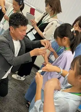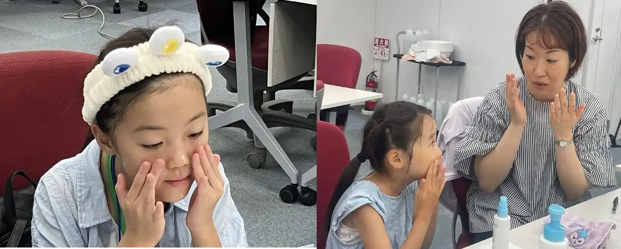 スキンケアの必要性や肌について知った後は、お子さん達によるスキンケアの実習を行いました。 |