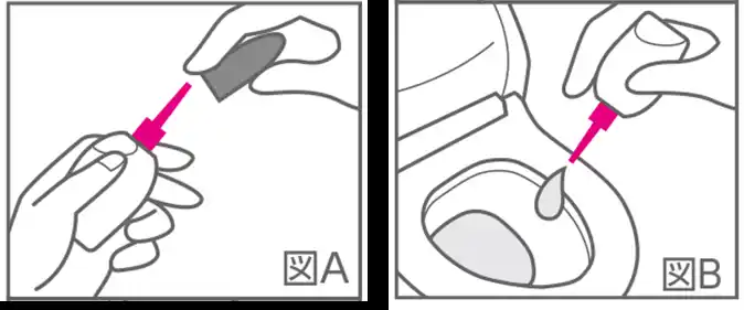 図Aのようにキャップをあけて、図Bのように便器の水たまり部分に1~2滴落として使用します。香りがすばやく広がり、ニオイを消します。 |