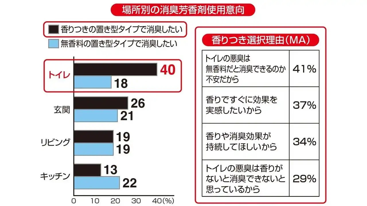 | 当社調査によると、トイレ用消臭・芳香剤には香り付きタイプを求める声が多く、その理由として、「トイレの悪臭は無香料だと消臭できるか不安」という回答が41%にのぼりました*¹。この結果からトイレ使用時にすぐに消臭効果を感じられる香りつきのトイレの5大悪臭専用の本製品を開発しました。 | ||||||||||||||