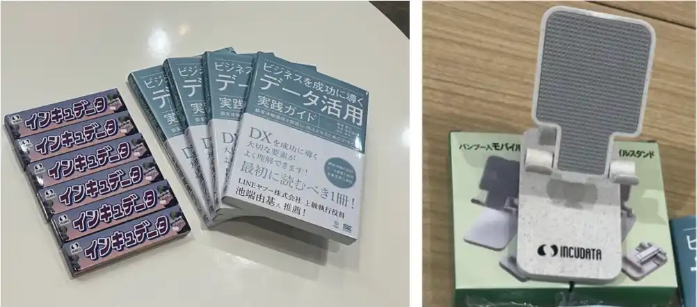 インキュデータ書籍、特製ハイチュウ、スマホスタンドなどの各種ノベルティ |