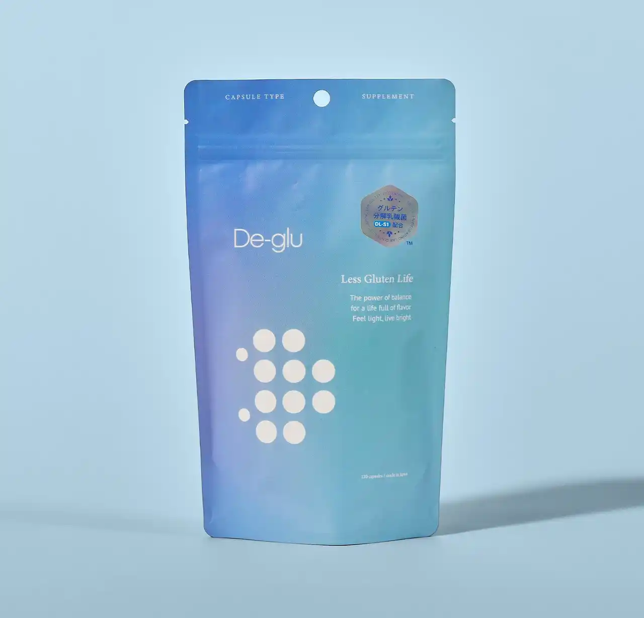 「De-glu(デグル)」は、韓国の伝統的な発酵食品から発見・開発された最大約70%のグルテン分解機能を持つ乳酸菌(※1)を配合した自社ブランドのサプリメントです。幅広いシーンでご使用いただけるよう、カプセルタイプと顆粒タイプの2種で展開します。 |