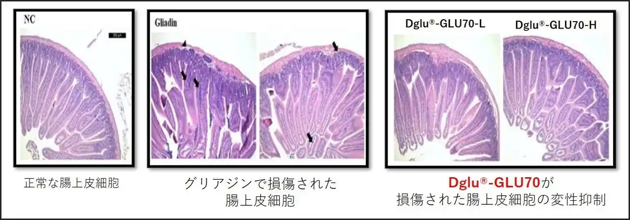 グルテン分解乳酸菌生菌混合粉末原料【DL-S1】に含有されている「Dglu-GLU70」菌株及び死菌体を、グリアジン(グルテン構成成分)が含有された餌とともにマウスに投与した実験試験において、グルテンが誘発する炎症性腸疾患の予防及び改善効果が認められました(※3)。 |