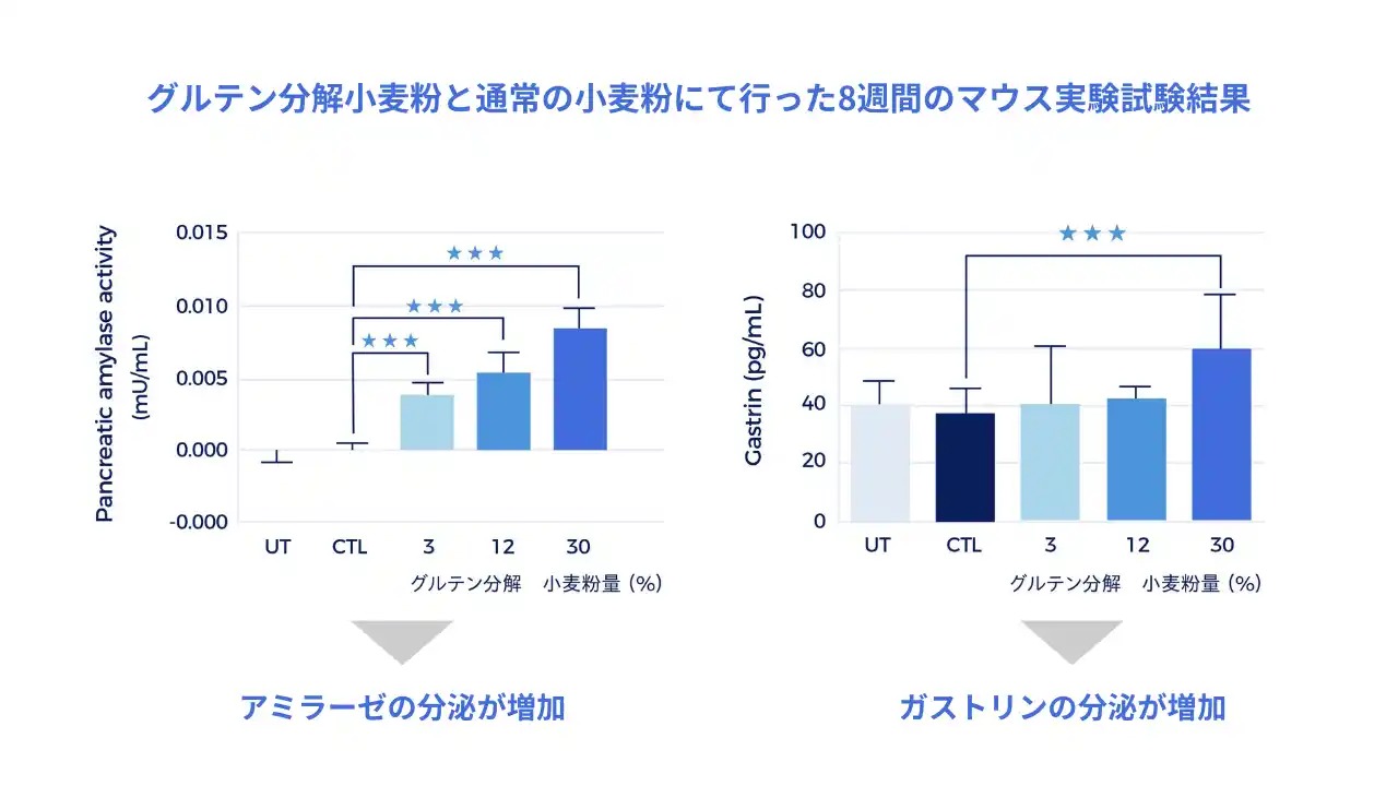 (2)消化機能活性化の可能性を示唆 ※マウス実験において グルテンを分解した小麦粉と、通常の小麦粉を摂取した8週間のマウス実験試験において、「Dglu-MB0601」菌株の含有量が高くなるほどアミラーゼ(糖質〈デンプン〉を分解する酵素)とガストリン(胃酸の分泌を促すホルモン)の分泌が増加することを確認できました(※2)。 |