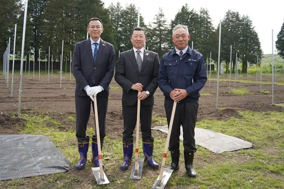 2025年5月14日、りんご生産者サポートの開始にあたり、青森県弘前市のJAつがる弘前管轄園地でりんごの苗木の植樹を行いました。 |