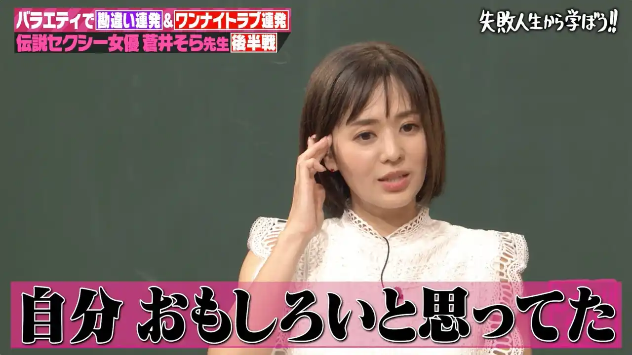 8月15日(金)の放送回では、元セクシー女優・蒼井そらさんによる授業の後編をお送りしました。前回の授業では、AV業界で“レジェンド”と呼ばれた栄光の裏で起きた数々のしくじりを告白。後編では、バラエティ進出での過信、引退後の奔放な恋愛遍歴など、自身の人生を赤裸々に振り返る衝撃の授業を展開しました。 |