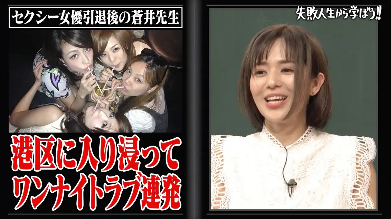 中国での成功を機に、AV引退を決断した蒼井先生。幸せな結婚生活に憧れていた蒼井先生は婚活をスタートしますが、その結果「港区に入り浸ってワンナイトラブ連発」という特大しくじりをやらかしてしまうことに...。「私の人生を振り返ると、これが1番のしくじりです」と語る蒼井先生は、当時の状況について「好きなった人が振り向いてくれないっていうフラストレーションで、全然知らない人とワンナイトラブして(気持ちを)上書きしたかった」と懺悔。「セクシー女優がプライベートで性に奔放になるのはダメと思っていて、現役時代は彼氏以外との体の関係はなかった。引退したらタガが外れて性に奔放になってしまった」と振り返り、「自分が1番なりたくない自分になって大後悔」と打ち明けました。 |