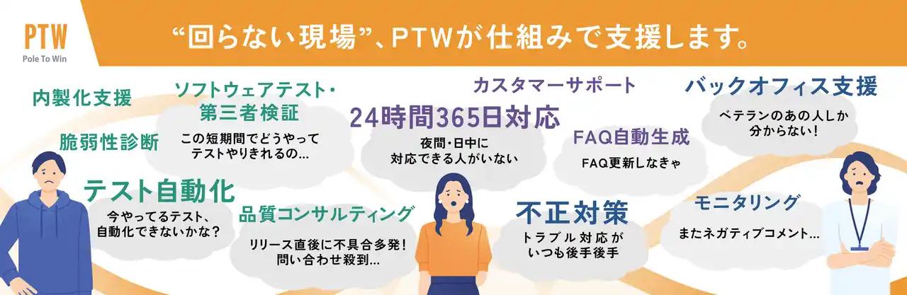 | サービスや製品をリリースした後に発生する不具合は、問い合わせ対応・監視対応といった運用フェーズに大きな負担をもたらします。ポールトゥウィンでは、ソフトウェアテストによる開発段階での品質確保から、運用における顧客対応・リスク監視までを包括的にサポート。“テストして終わり”ではなく、“成果を守り抜く”ためのBPO設計をご提案します。 | |||
