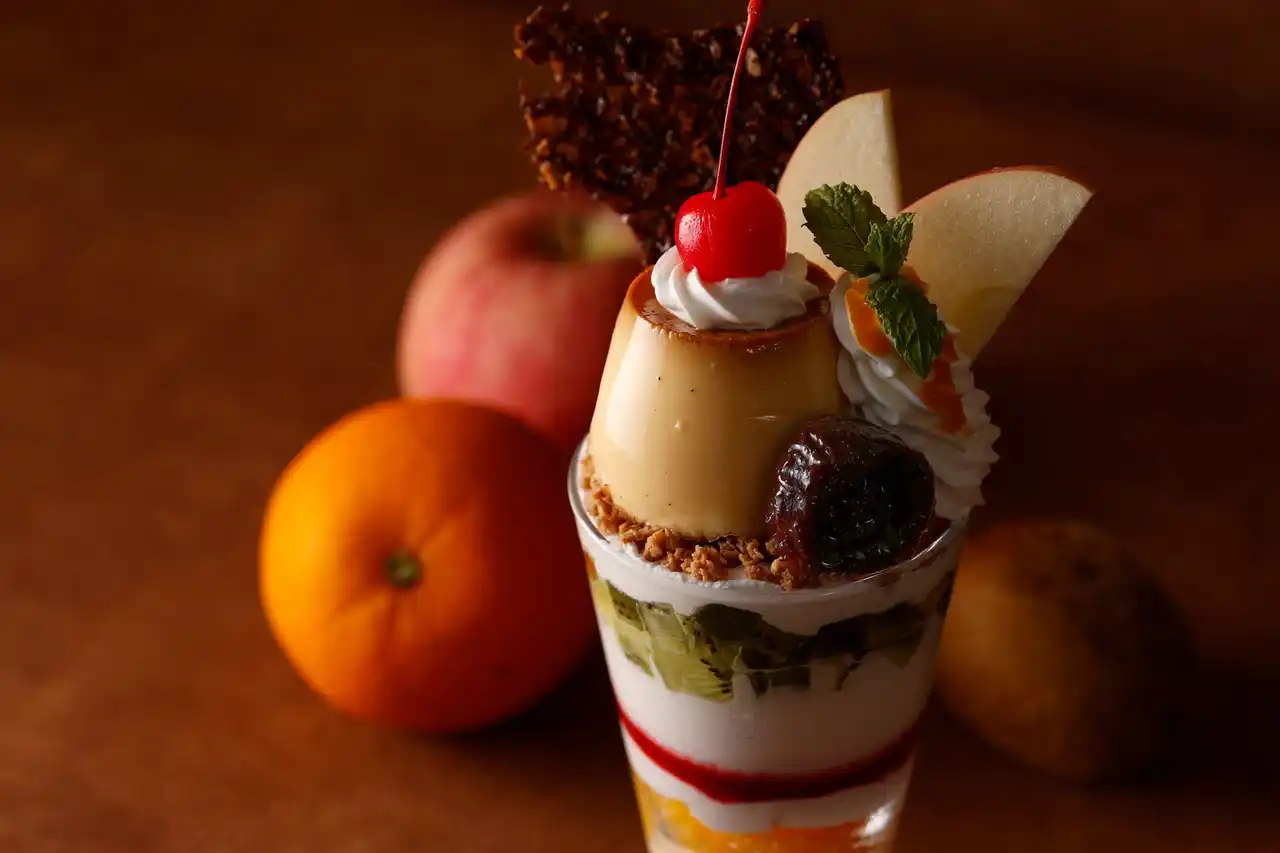 パフェ」は、2022年より毎年期間限定で販売をしており、今年もお客様からの再販の要望を受け、より美しく贅沢にアレンジして提供します。「プリン・ア・ラ・モード」の彩りある華やかなビジュアルを活かし、トップには伝統のプリンを主役に、リンゴやプルーン、生クリーム、さくらんぼをトッピング、グラスには自家製のバニラアイスや色鮮やかなフルーツを重ね、ヨーグルトムースで層を作り、一匙ごとに多彩な美味しさに出会えるパフェに仕上げました。