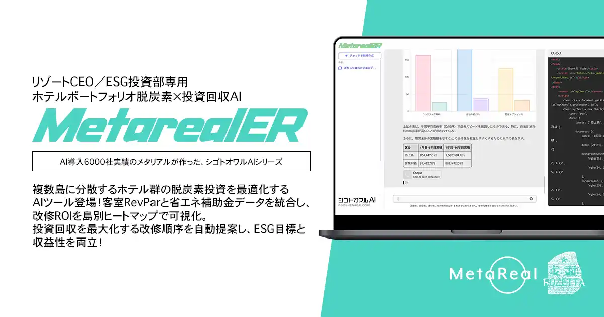 メタリアル・グループの株式会社ロゼッタ(代表取締役:五石 順一)は、ホテルポートフォリオ脱炭素×投資回収AIエージェント「Metareal エコリゾート」(以下、Metareal ER)を8月18日(月)に新開発・提供開始しました。 |