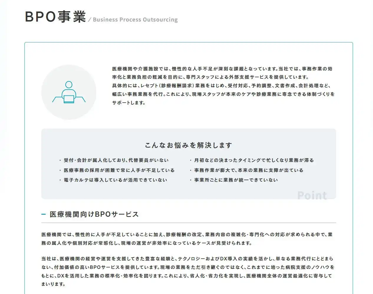 | 主な事業内容:医療機関・介護施設向けBPO事業、業務支援システムの開発・提供、コンサルティング事業 | |||