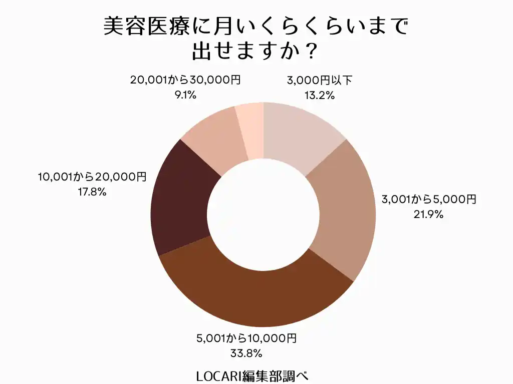 美容医療にかけられる月ごとの予算では、「5,001~10,000円」と答えた人が最も多く(33.8%)、続いて「~5,000円」が併せて28.3%という結果に。施術内容によって金額に幅が出るため、希望する施術の価格帯によってバラつきが見られました。 |