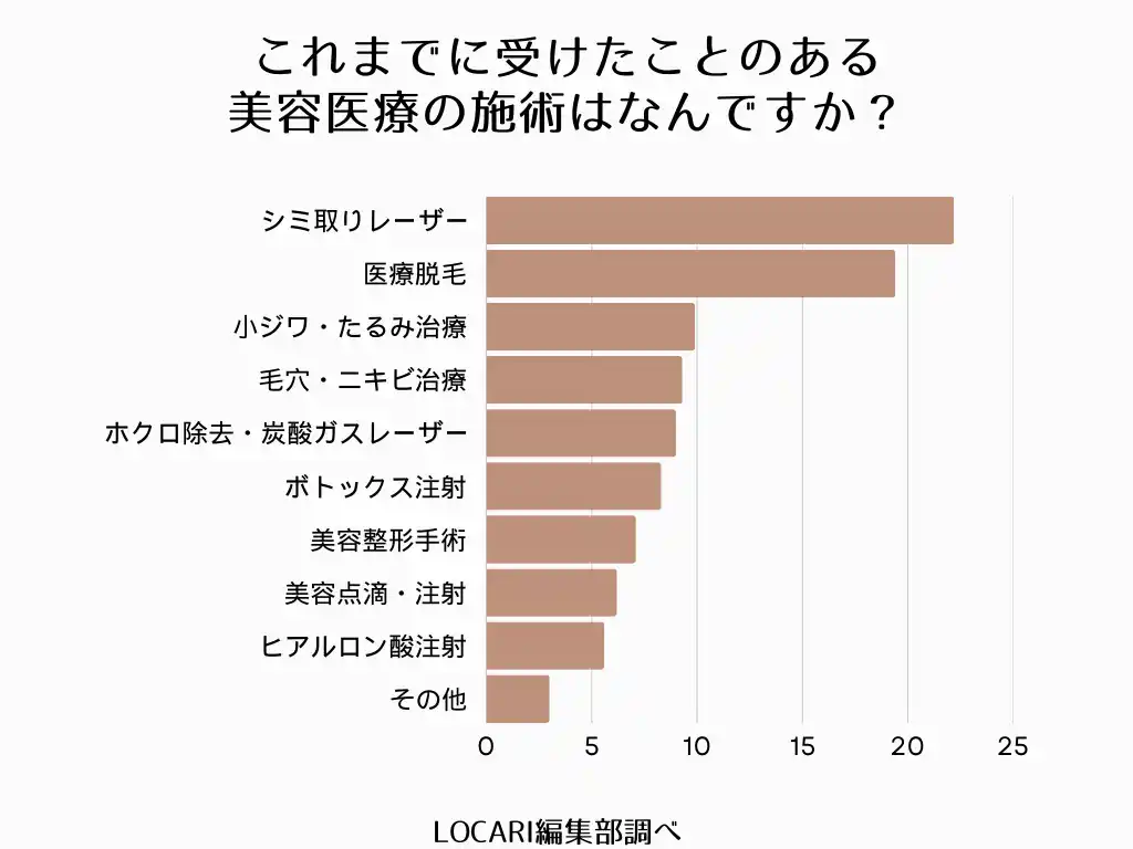 経験者に対して具体的な施術を尋ねたところ、最も多かったのは「シミ取りレーザー(22.2%)」と「医療脱毛(19.4%)」。いずれも約2割の人が挙げており、美肌やムダ毛対策へのニーズが高いことがわかりました。 |