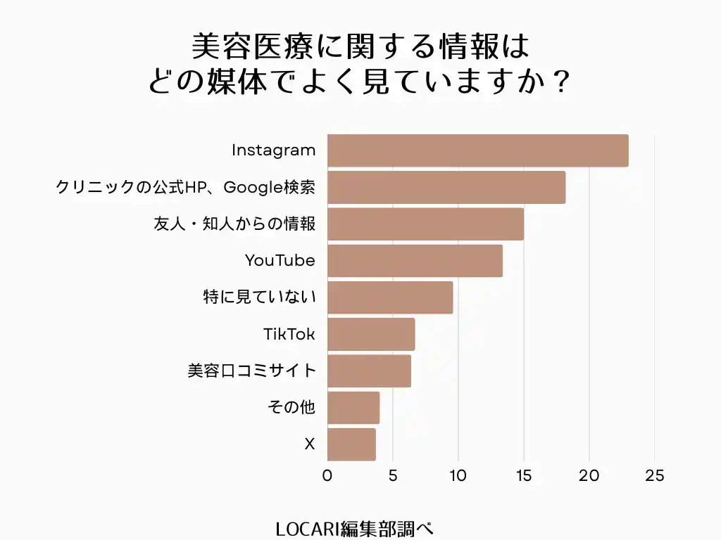 美容医療に関する情報源としては、「Instagram(23%)」が最も多く、SNSの影響力が大きいことがうかがえます。次いで「クリニックの公式HP」や「Google検索」が18.2%、さらに「友人・知人からの情報」が15%、「YouTube」も13.4%とかなり重要視されていました。 |