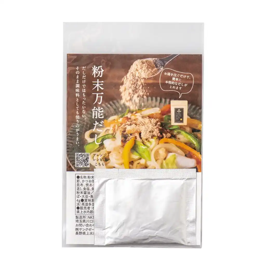 店舗で「万能だしポテトチップス」をご購入の方に、「粉末万能だし(お試しサイズ)」を1袋プレゼントいたします。 |