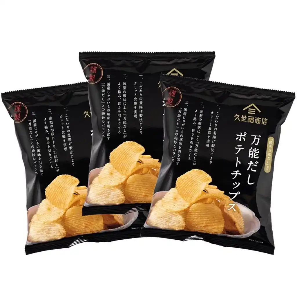 久世福商店の人気商品「粉末万能だし」を贅沢に使用し、だしの魅力をぎゅっと閉じ込めたポテトチップスです。焼津製造の鰹節、北海道産の昆布、瀬戸内産のいりこ、焼きあご、さば節など、全国の厳選素材を絶妙なバランスで配合した「粉末万能だし」を、チップス全体にたっぷりとまぶしました。チップスは、釜揚げ製法によりサクッとした歯ごたえとカリッとした食感を両立した波型形状。 「だしって、こんなにおいしいんだ」と感じていただける、ちょっと特別なひとときをお届けします。 |