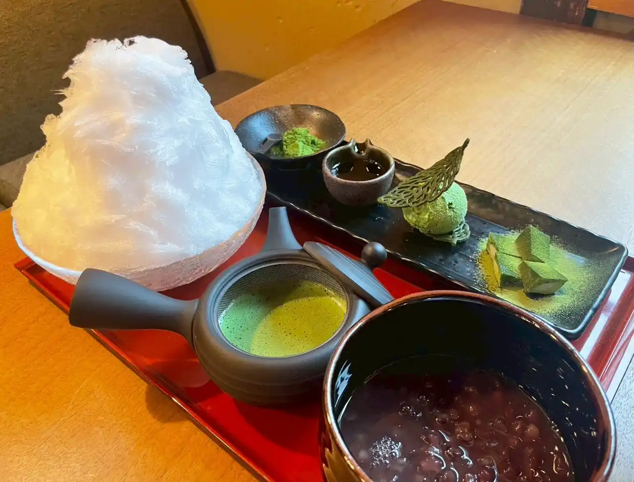| 特製の冷やし小豆を添えた茶器に、氷や凍りわらび餅、抹茶ジェラート、抹茶を注げば「冷やし抹茶ぜんざい」としてもう一品楽しめる宇治抹茶づくしの贅沢な構成です。 | |||||||||
