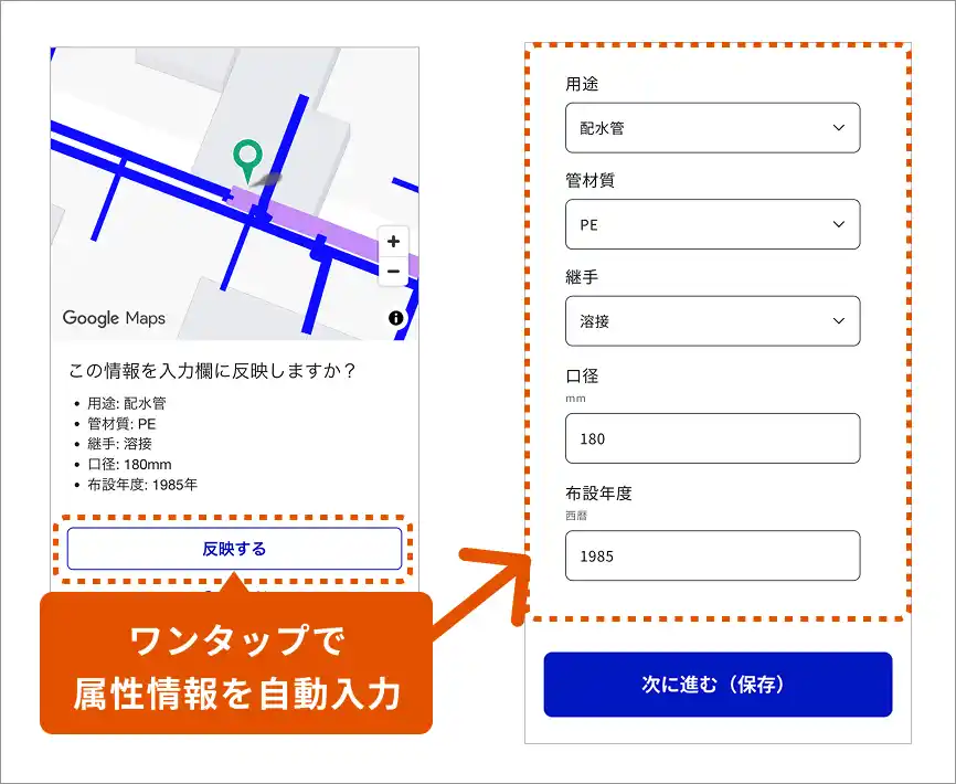こうした現場の声に応えるため、業務の流れに合わせて登録画面を4つのステップに分割し、各段階で必要な情報を確実に記録できるよう改善しました。地図上で該当する水道管をワンタップで選択するだけで、管材質、口径、布設年度などの詳細な属性情報が自動的に入力フォームに反映されます。水道管データを標準化したことで、こうした属性情報の自動反映が可能となりました。また、写真登録機能の追加や必須入力項目の廃止により、現場での負担を軽減します。 |