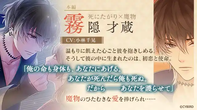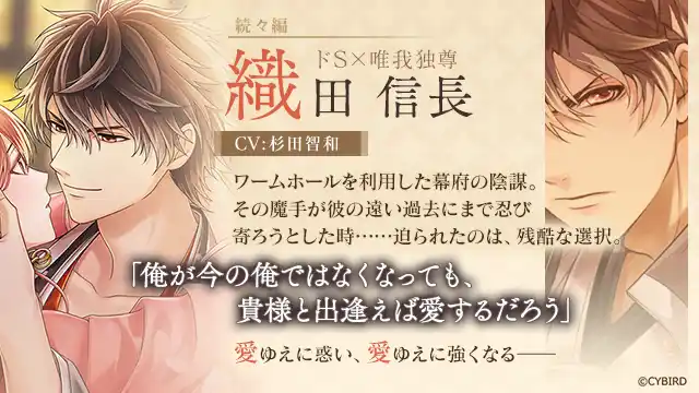 また、配信開始日よりお楽しみいただける長編ストーリーして、新章「第三幕」の物語となる織田信長(CV:杉田智和)続々編、霧隠才蔵(CV:小林千晃)本編、千利休(CV:堂島颯人)本編と、『イケメン戦国』からの移植となる織田信長本編/続編、伊達政宗・上杉謙信の本編の配信も決定しました。 |