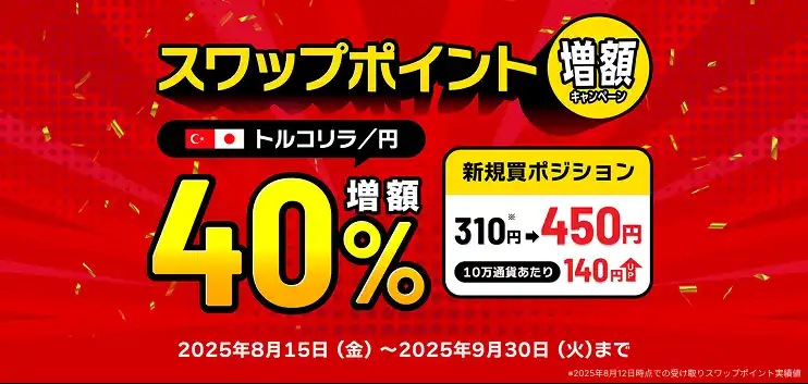 さらに今ならキャンペーン期間中のスワップポイントを40%増額する「トルコリラ/円スワップポイント増額キャンペーン」を開催中! |