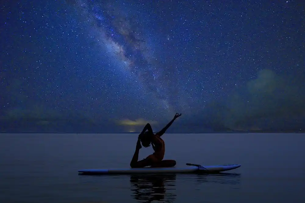 ビーチフロントのプールで海風を感じるSUPヨガは、まるで自然とひとつになるような特別な時間。 |
