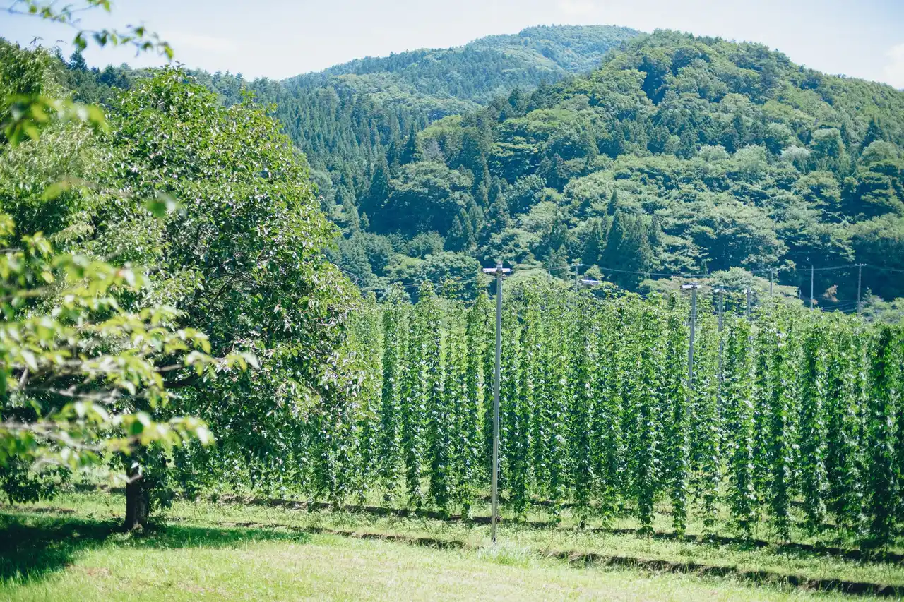 また、ホップは前職時代から付き合いのある田村市大越町のホップ農家が丹精込めて育てた高品質のものを使っています。蒸留所のある川内村からホップ畑までの距離は、わずか車で30分。ホップは酸化しやすいため、通常フレッシュホップといっても冷凍のものが使われることが多いなか、この立地条件を生かして、畑で収穫してから1時間以内に仕込むということにも挑戦しました。 |