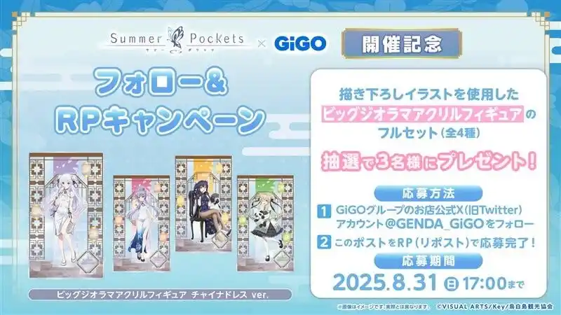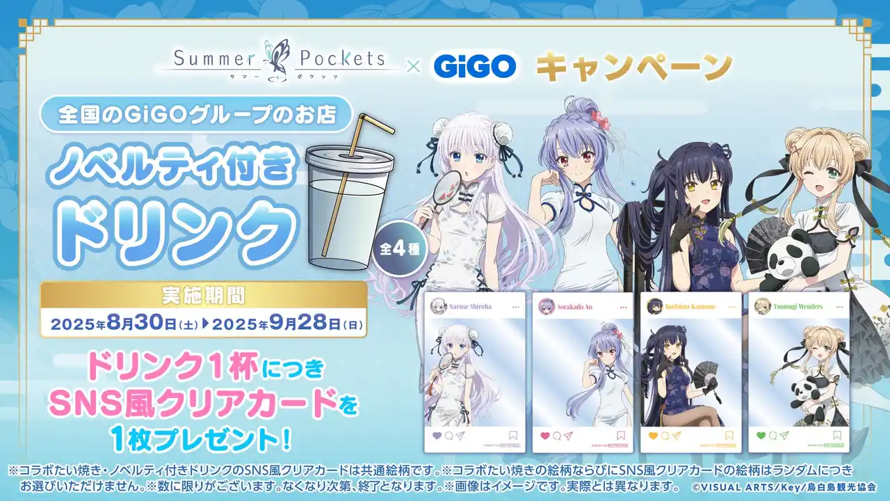 株式会社GENDA GiGO Entertainment(本社:東京都港区 代表取締役社長:二宮 一浩 以下「当社」)は GiGOグループのお店におきまして、『CLANNAD』『リトルバスターズ!』『Angel Beats!』などで知られるビジュアルアーツ・Keyの最新フルプライス作品 TVアニメ『Summer Pockets』とコラボした「SummerPockets × GiGOキャンペーン」を2025年8月30日(土)から開催いたします。 |
