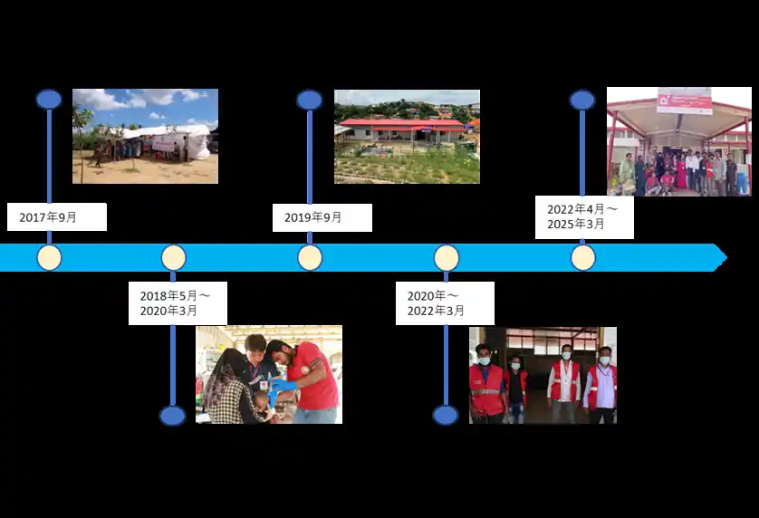 日本赤十字社は、避難民の大量流入直後の2017年9月より、国際赤十字とともに緊急支援活動を開始。現在はバングラデシュ赤新月社と協力して、避難民のレジリエンス強化や持続可能な支援の提供を見据えた中長期的な活動を行っています。 |