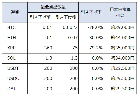 より気軽にご利用いただけるよう、BTC・ETH・XRPの新規お貸出し時に必要な最低数量を、日本円換算で4万円前後(※1)に引き下げいたしました。 |
