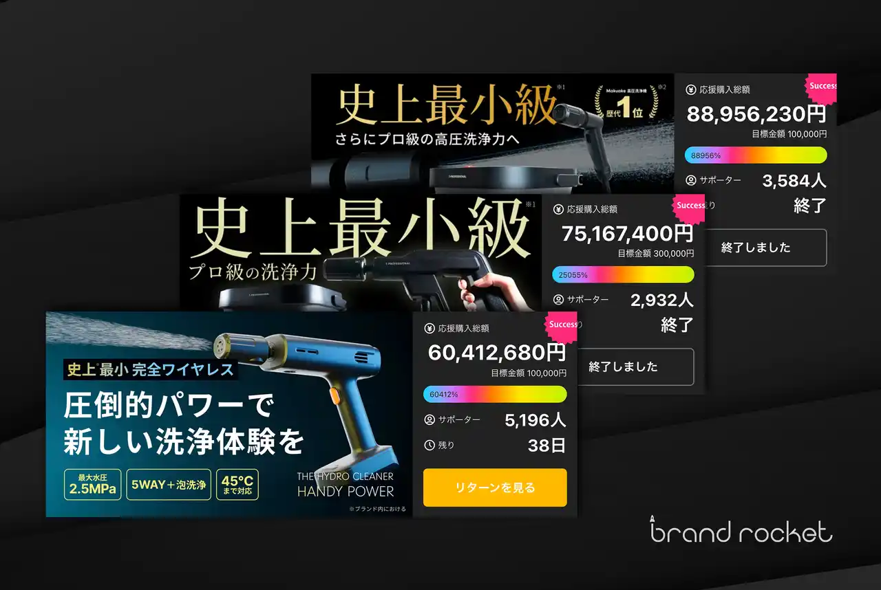初回から3度にわたり、複数回のMakuake展開をサポート。全プロジェクトがMakuake総合ランキング1位ならびに、歴代ランキングインを達成。現在進行中の「T-PROFESSIONAL HYDRO CLEANER HANDY POWER」においては、プロジェクト2日目にして累計応援総額3000万超えを達成しました。 |