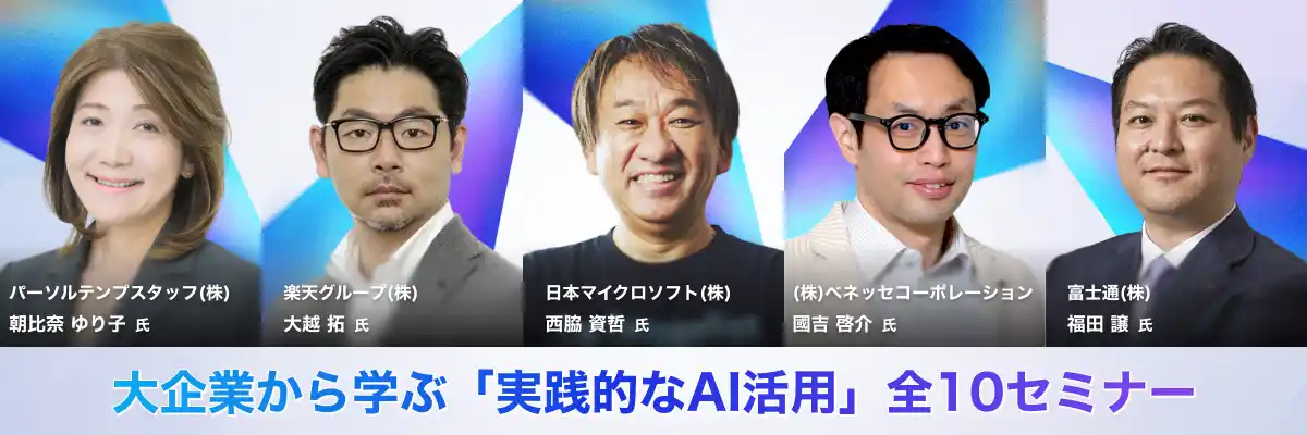 | グーグル・クラウド・ジャパン合同会社、日本マイクロソフト株式会社、富士通株式会社、パーソルテンプスタッフ株式会社、楽天グループ株式会社、株式会社ベネッセコーポレーションなど、DX推進やAI活用の最前線で活躍する企業が登壇し、実践的な事例や活用ノウハウを紹介します。 | |||||||||