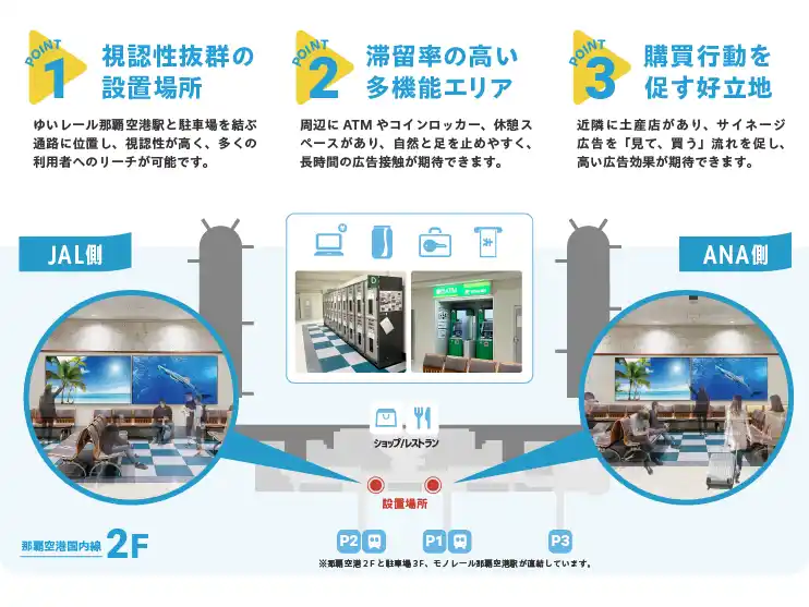 | 沖縄は年間を通じて国内外から多くの観光客が訪れる人気観光地であり、那覇空港はその主要な玄関口として年間で約2,000万人もの利用者が利用します。当社は、この高い集客力を誇る那覇空港において、視認性の高いデジタルサイネージを活用し、自社ブランドおよびサービスの魅力を最大限に発信するため、本取り組みを開始しました。 | |||||||||||||||
