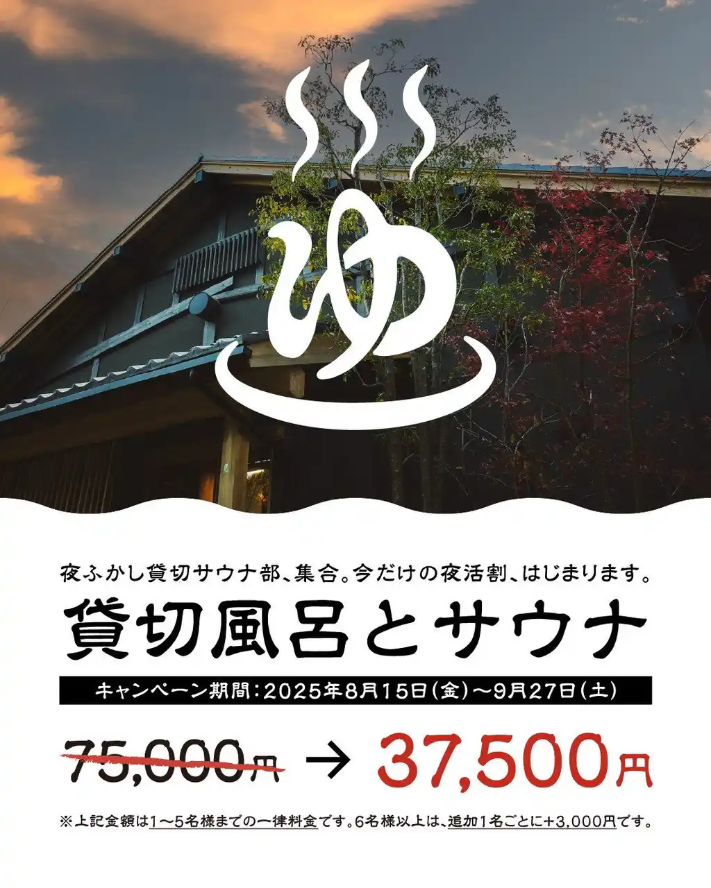 | 静岡市の温浴施設「ふきさらし湯」(運営:株式会社創造舎、代表取締役:山梨洋靖)は、2025年8月15日(金)~9月27日(土)の期間、夜間の貸切サウナ&美肌軟水のお風呂プランを通常価格の半額で提供いたします。肌あたりが良いこだわりの軟水のお風呂と水風呂、本格サウナを仲間やご家族でゆったりとお楽しみいただけます。 | ||||||||||||||